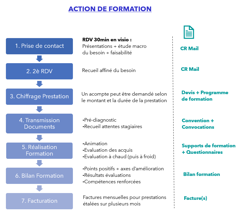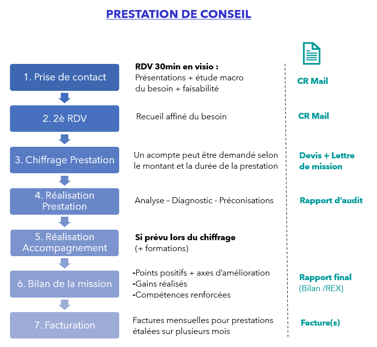 Voici les différentes étapes suivies dans le cadre d’une prestation de conseil ou d’une action de formation, depuis l’analyse du besoin jusqu’au bilan et à la facturation.